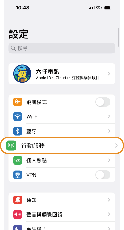 開啟「設定 > 行動服務」,點擊「行動數據」