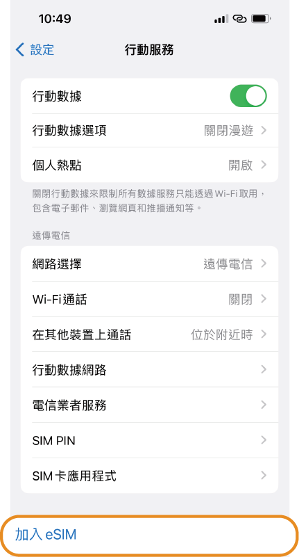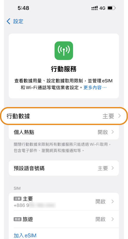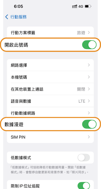 開啟「設定 > 行動服務 > 旅遊」,確認開啟「開啟此號碼」和「數據漫遊」
