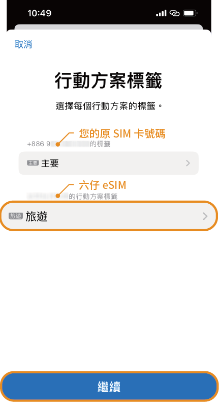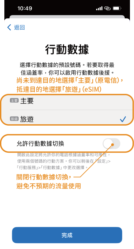 如人在台灣,行動數據請選擇「主要」,抵達目的地再切換為「旅遊」
