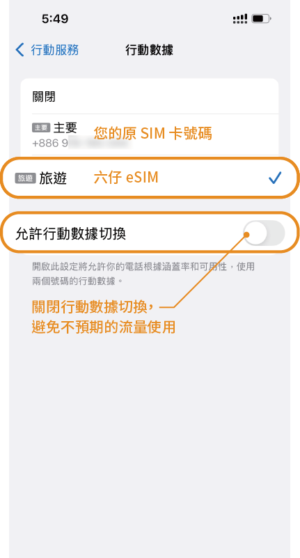 選擇「旅遊」,並關閉「允許行動數據切換」,完成後回到前一頁